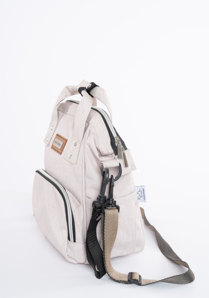 - تحتوي على جيوب متعددة، منها جيب أمامي بسحاب، وأخرى جانبية لوضع زجاجات الرضاعة أو المناديل او زجاجة مياة.